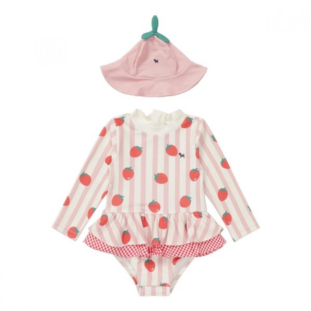 The 'Strawberry All-in-One Swimsuit' is a set of girls' swimwear designed with a strawberry all-over pattern. It features a convenient back zipper for easy wear, and comes with a bucket hat that has a leaf as its highlight, allowing for a cool experience in seasonal sports.