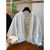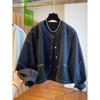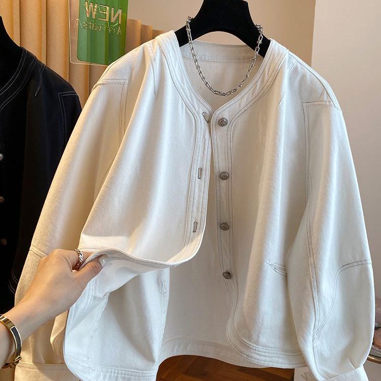 Biała Szeroka Jeansowa Kurtka Damska Sense - Luźna, Bez Kołnierza, Zakrzywiony Detal na Wiosnę i Jesień 2025