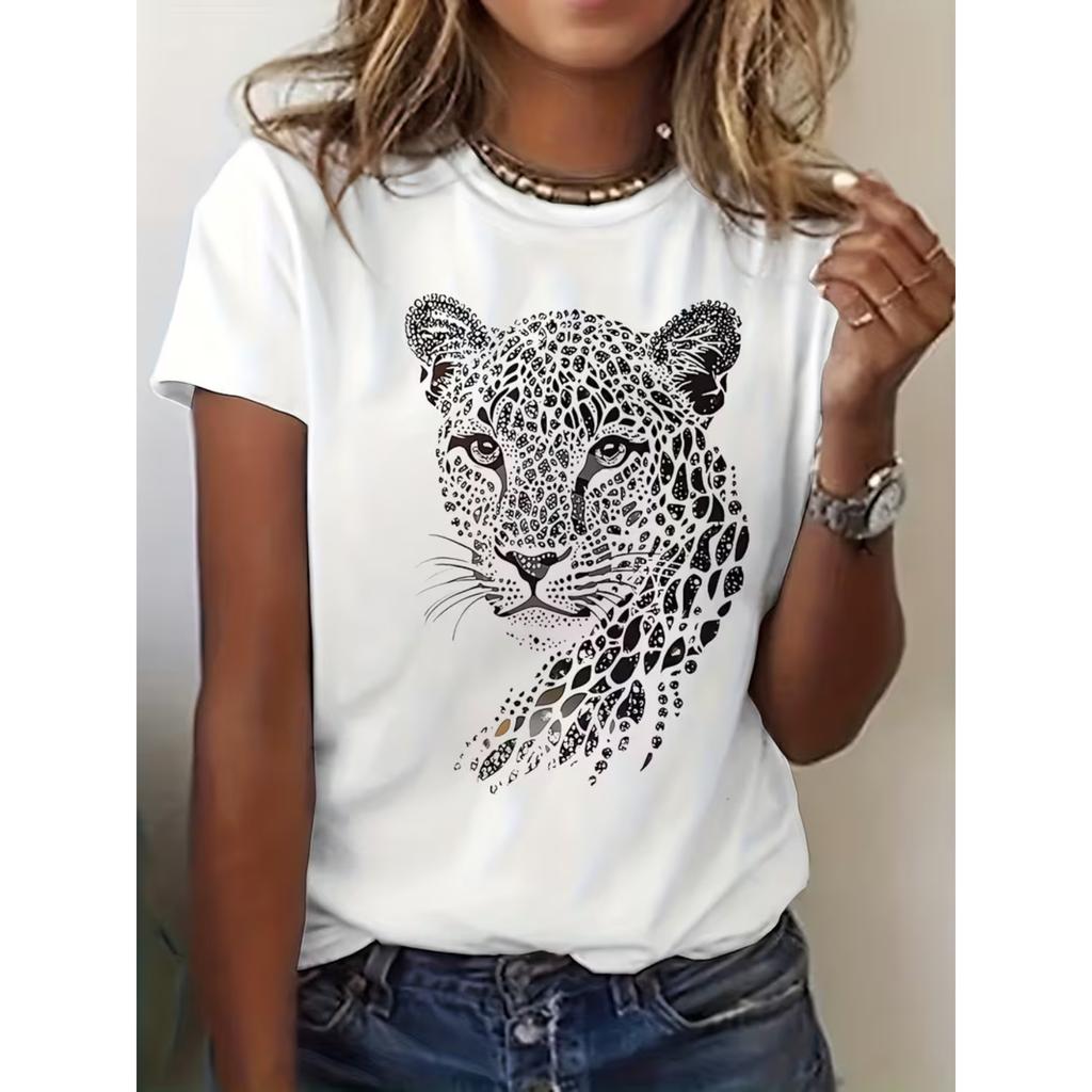 Stylish Leopard Print T-Shirt with Short Sleeves and A Crew Neck, Perfect for Casual Wear in Summer and Spring, Designed for Women