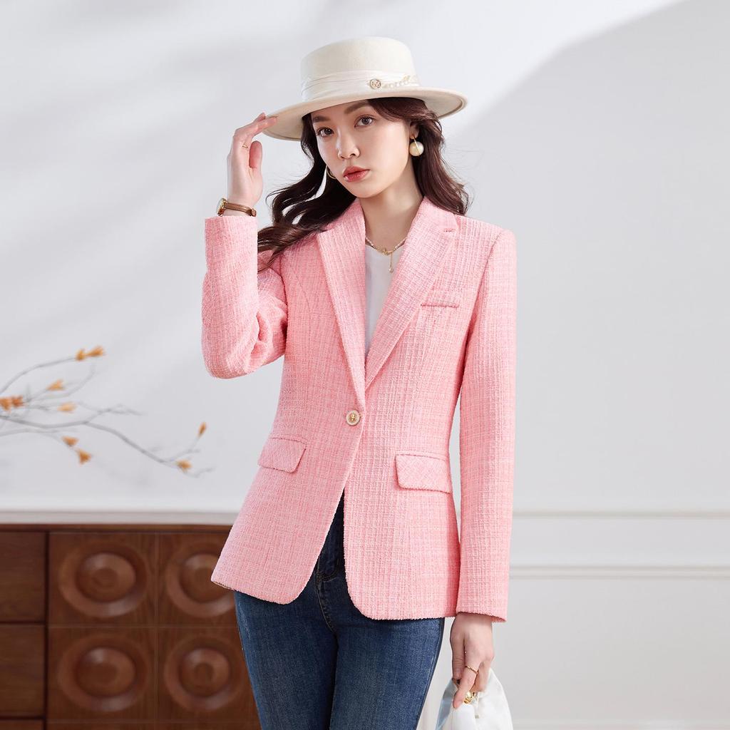 Introducing a high-end casual jacket crafted for those who appreciate style and comfort. This slimming jacket offers a fresh, trendy look perfect for the spring season. Made from a blend of chemical fibers, it provides both durability and a lightweight feel. The jacket's elegant pink hue adds a touch of sophistication to any outfit, making it an ideal choice for both daytime outings and evening gatherings. Embrace a fashionable statement piece that seamlessly combines modern design with timeless appeal.