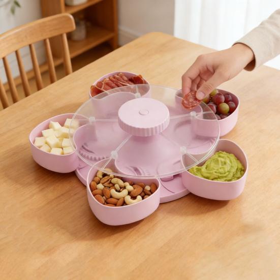 Pięciokomorowa obrotowa taca na przekąski—praktyczna i zabawna—idealna na bufety z tacos lub przekąski na wieczór filmowy. Jego funkcja obracania umożliwia zarówno wygodne podawanie przekąsek, jak i kompaktowe przechowywanie, czyniąc go niezawodnym niezbędnikiem na imprezę..