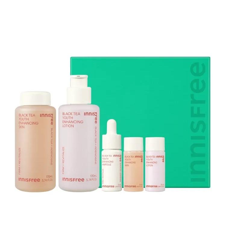 Restore youthful vitality with the Innisfree Black Tea Youth Enhancing Skincare Set. Powered by fermented black tea extract, this anti-aging duo helps improve skin elasticity, reduce the appearance of fine lines, and deeply hydrate the skin. The toner refreshes and balances the skin, while the lotion locks in moisture for a smoother, firmer complexion. Ideal for daily skincare to maintain healthy, resilient, and radiant skin.