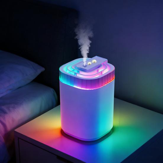 Ukośna LEDowa lampka atmosferyczna zmieniająca kolor: Zintegrowany z miękkim, kolorowym światłem LED, które zmienia odcienie, ten nawilżacz dodaje nastrojowego blasku każdemu pomieszczeniu.. Użytkownicy mogą dostosować oświetlenie do swojego nastroju lub wystroju, tworząc ciepłą i przyjazną atmosferę. Ta stylowa funkcja poprawia relaks i uzupełnia różne style wnętrz, jednocześnie zapewniając funkcjonalną kontrolę wilgotności.
