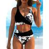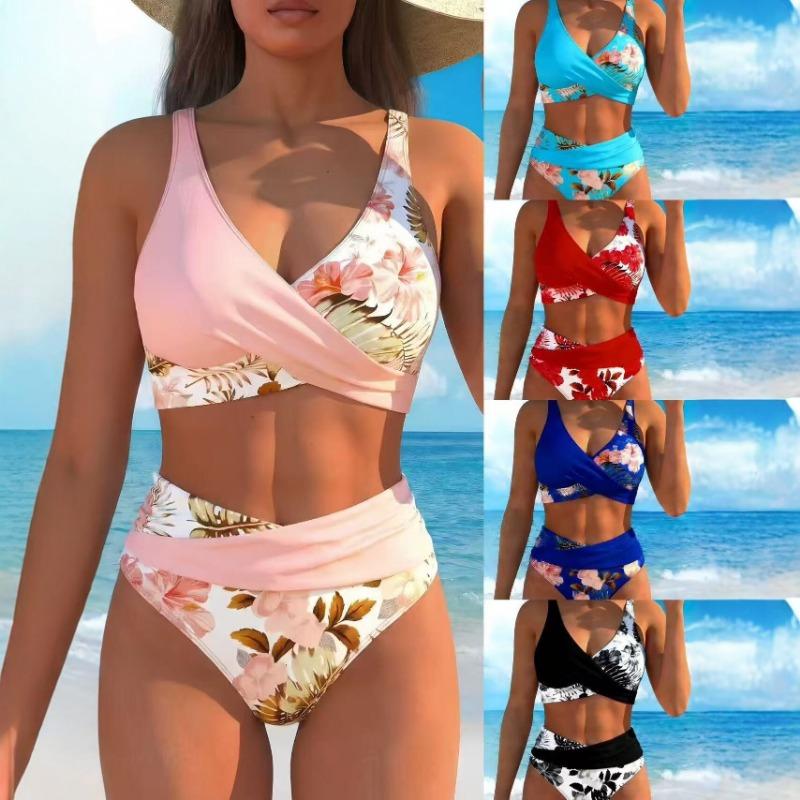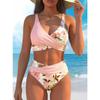 Women's Pink Floral Print High Waist Bikini Set, Color Block Wrap Two Piece Swimwear