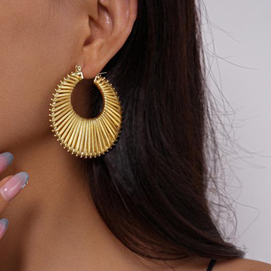 Te wszechstronne kolczyki bez wysiłku podkreślą zarówno formalne, jak i codzienne stylizacje, czyniąc je idealnymi na każdą okazję.. Wykonane na metalowej podstawie w kolorze złota z ząbkowanym okręgiem owiniętym kolorową sztuczną skórą, oferują unikalną teksturę i żywy kontrast.. Ich lekka konstrukcja zapewnia komfort noszenia przez cały dzień, niezależnie od tego, czy są noszone z dżinsami i T-shirtami, czy z sukienkami plażowymi..