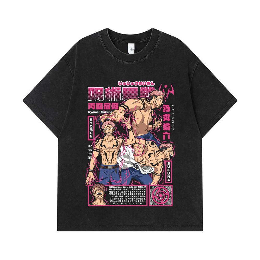 275 GSM Washed T-shirts 100% Cotton Jujutsu Kaisen V45 Sukuna Print Unisex Heavy Cotton T Shirt