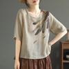 Bawełniano-lniany T-shirt Top Damski Letni Nowy Luźny Okrągły Dekolt Oddychający Cienki Z Nadrukiem Artystyczny Retro Krótki Rękaw Damski Top