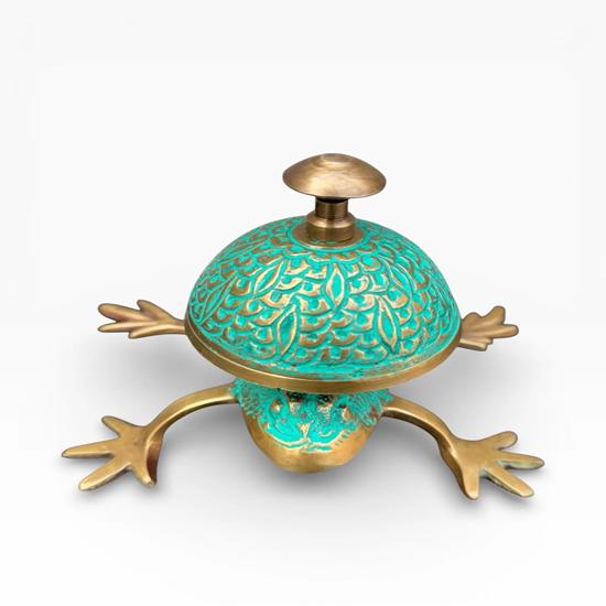 Crafted from solid brass, this frog desk bell is durable, sturdy, and designed to produce a clear, pleasant ringing sound with a simple press. The antique-inspired green patina finish gives the bell a classic aged appearance, making it an eye-catching decorative piece for any workspace, front desk, or vintage-themed interior.