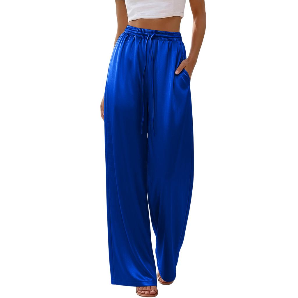 Damskie casualowe, lejące, satynowe spodnie z wysokim stanem i szerokimi nogawkami, z drapowaniem
