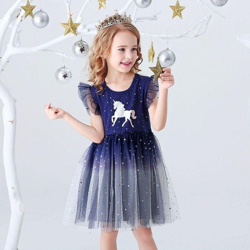 Girls' Fashionable Short-Sleeve Unicorn Dress: Summer Children's Tulle Princess Dress