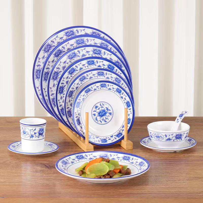 Blue & White Melamine Porcelain-Look Round Plate: Thickened, Durable for Stir-Fry, Rice, and Restaurant Use