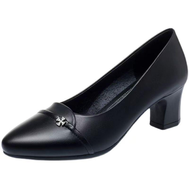 Women's Leather Pointed-Toe Pumps Comfortable Chunky Heel Dress Shoes with Rhinestone Detail