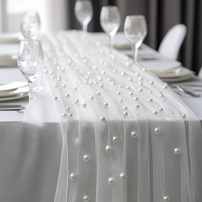 Gazowy Biegacz na Stół Romantyczny Siatkowy Obrus z Pereł Pokrowiec na Stół Weselny Jadalny Dekoracja na Urodziny Baby Shower Imprezowy