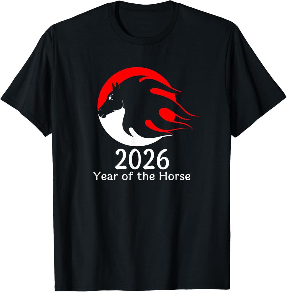 Year of The Horse 2026 Fire Horse Chinese Zodiac New Year Cool Trending Pattern Printed Tshirt Tops Crewneck Hortsleev Adult