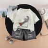 This playful two-piece set is perfect for summer adventures. Crafted from comfortable cotton, it features a trendy short sleeve top adorned with a fun dinosaur cartoon print. Paired with matching shorts, this stylish outfit is designed to keep boys cool and active during the warm months. Ideal for casual outings or playful days at home, it's a must-have addition to any young dinosaur enthusiast's wardrobe.
