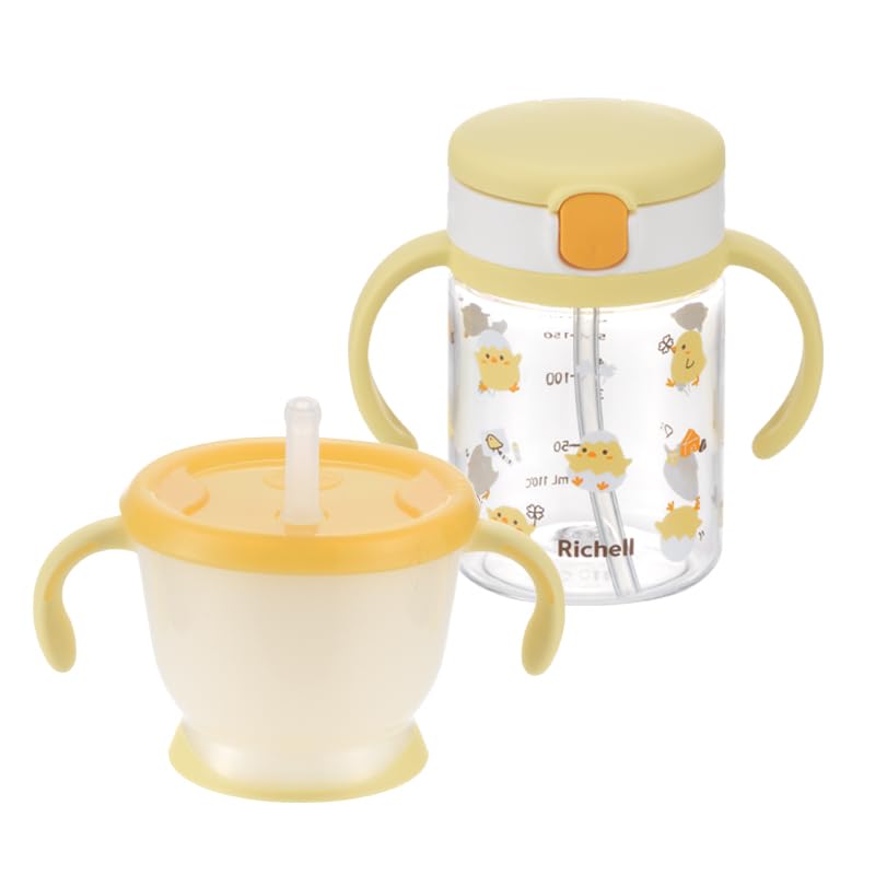Richell Acria Straw Mug Set KN Light Yellow (Suitable for babies from 6 months old) - Easy to drink from, leak-proof.