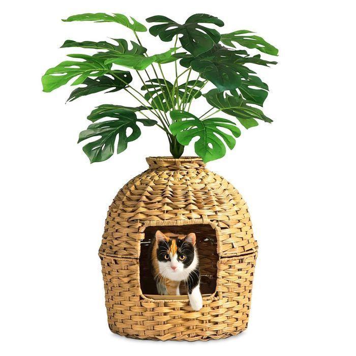 Kuwerka dla kota - CT03 Divit - Wygląd brązowego rattanu - Zintegrowana sztuczna roślina - Wyjmowana tacka