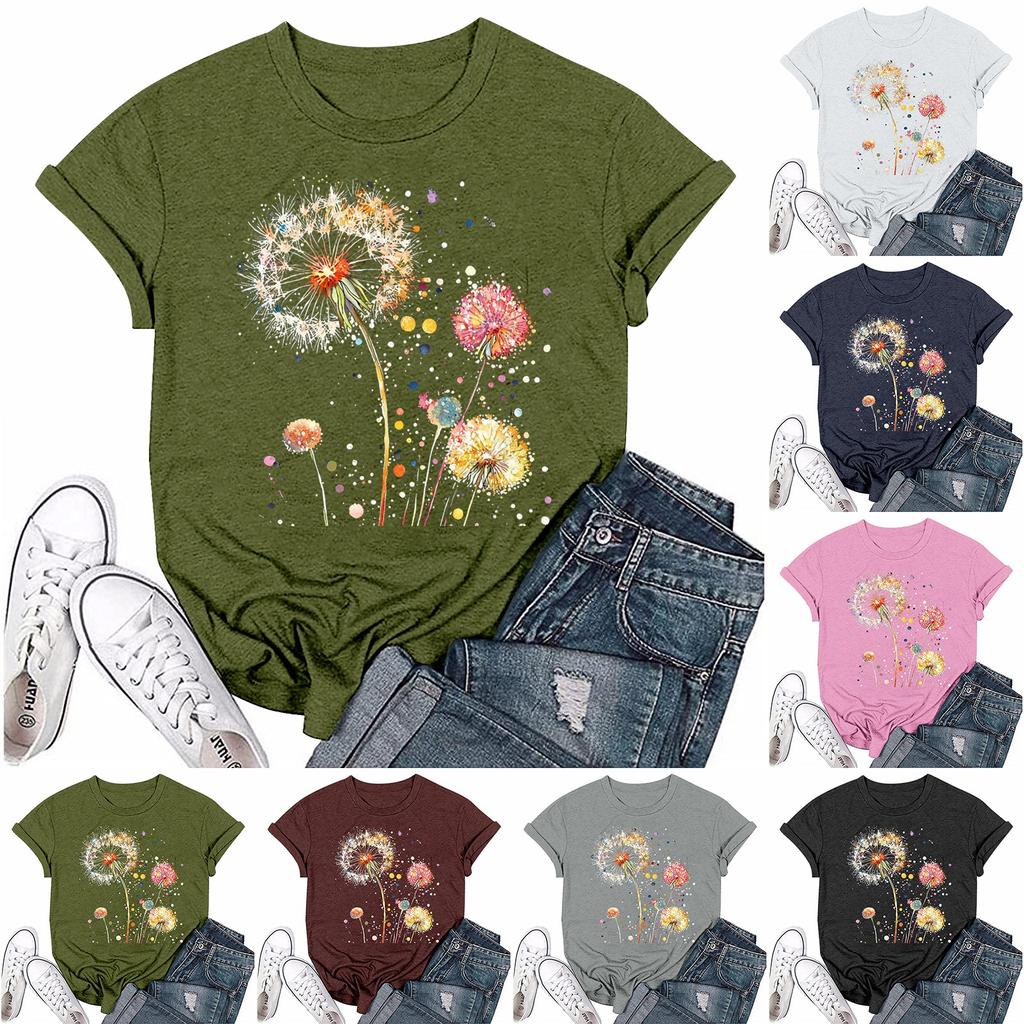 Damska modna koszulka z okrągłym dekoltem i krótkim rękawem, z nadrukiem, pulowerem