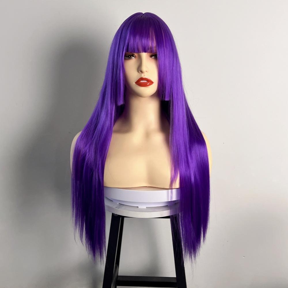 Qi Bangs Long Straight Wig Synthetic Full Head Cover Purple Hime Style Colored Hairstyle Set