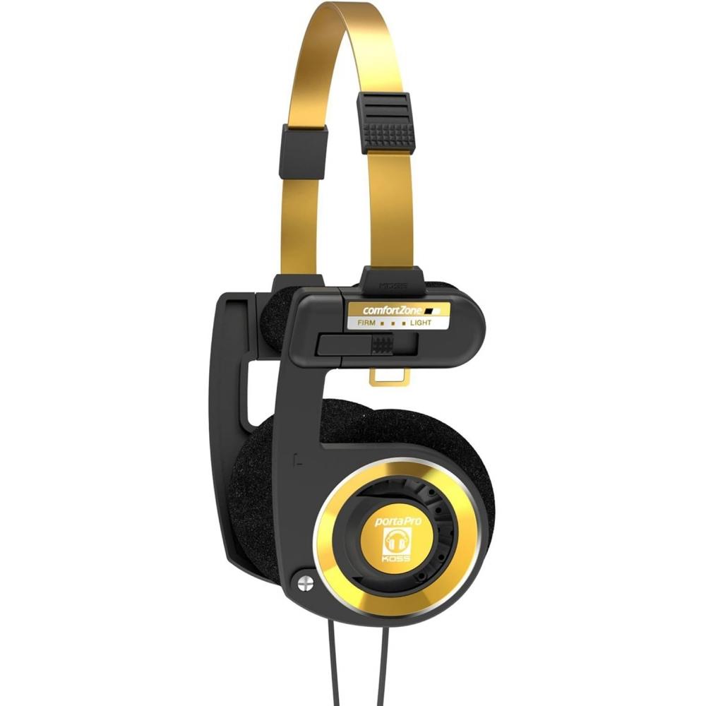 The Koss Porta Pro Limited Edition Black Gold On-Ear Headphone features a classic design with modern elements. Equipped with an inline microphone and volume control function, it adds convenience for the user. This product comes with a hard carrying case and a 3.5mm plug, highlighted by a sophisticated combination of black and gold colors.