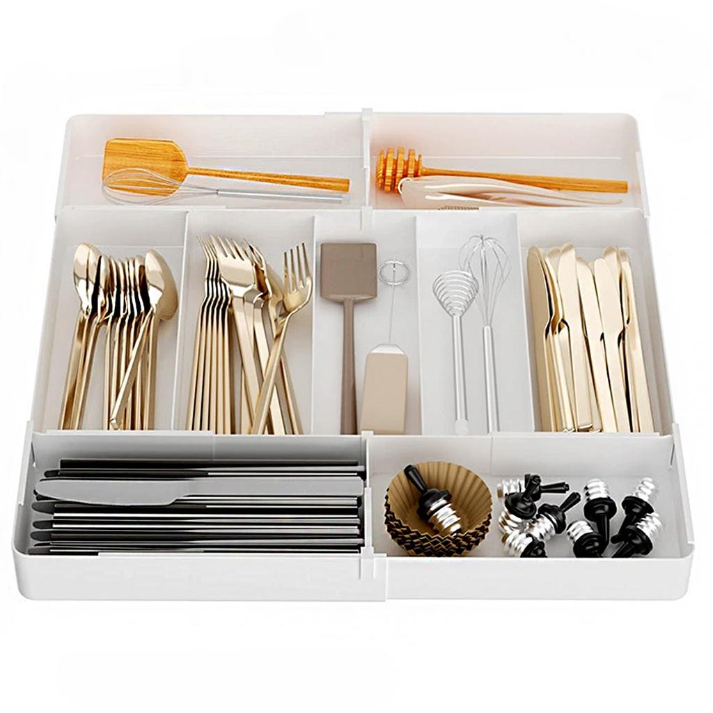 【Klasyfikacja Naukowa i Przechowywanie】Wielofunkcyjny, podzielony na przegródki system został starannie zaprojektowany. Długie, wąskie przegródki mogą pomieścić noże, widelce i pałeczki.; Większe przegrody pomieszczą chochle i łopatki; a kompaktowe mniejsze przegródki mogą pomieścić drobne przedmioty, takie jak miarki i otwieracze do butelek.