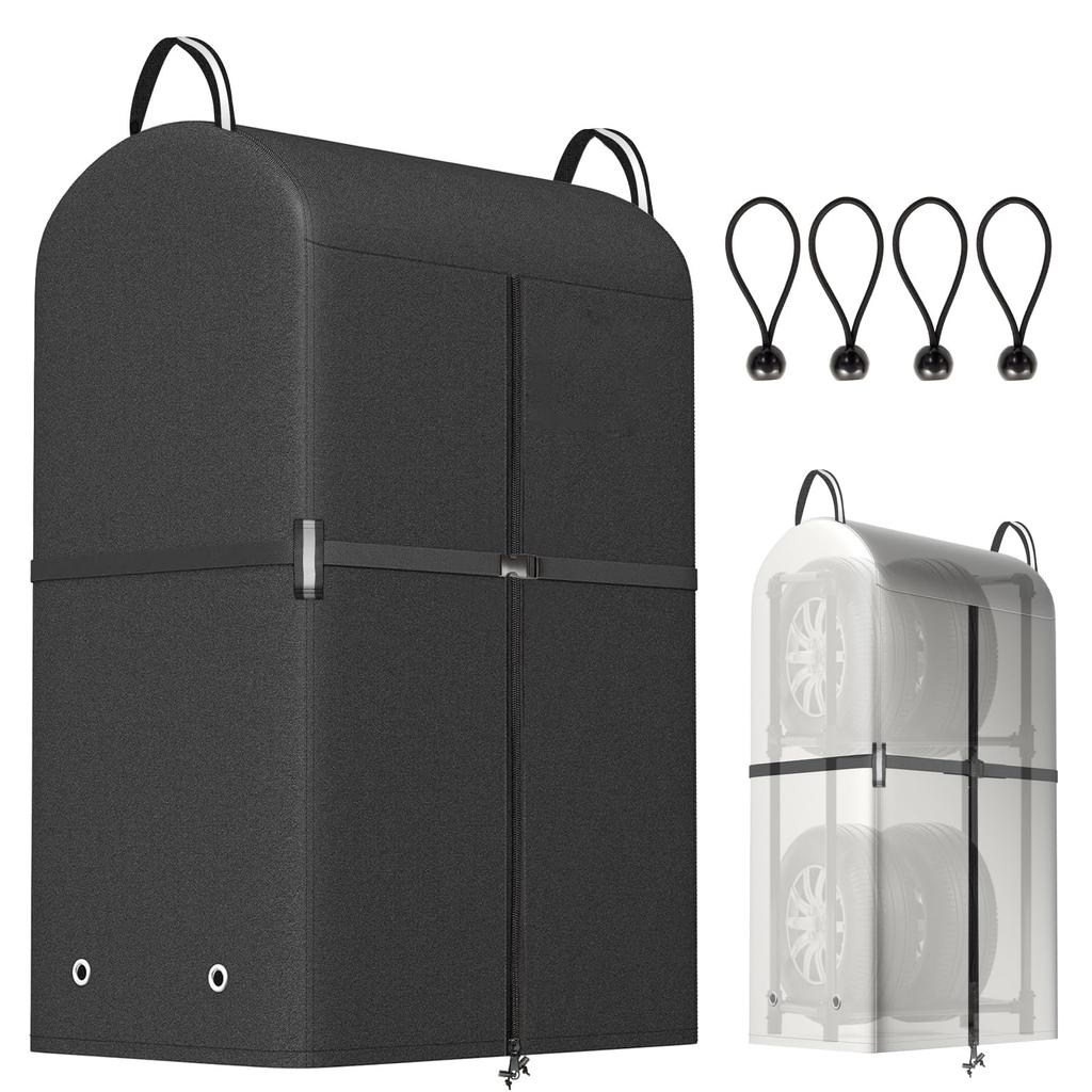 【Excellent Waterproofing & Strong Windproof Design】This outdoor tire cover boasts a waterproof rating of 10,000 Pa. Its waterproof zipper and precise double stitching prevent water intrusion, making it tear-resistant even with prolonged use and keeping tires dry after rain or during the rainy season. The tire storage bag features an adjustable drawstring at the bottom for a snug fit on the tire rack, and four ball ropes securely fasten it to the legs, preventing it from blowing away and ensuring stability. The tire cover features a reflective waist tab for increased visibility in dark places. A 4M windproof rope can be threaded through the tab and tightened with the adjustable buckle, ensuring a secure fit even in strong winds. Installation is easy for anyone: simply unfold, wrap the tire, and tie with the strings.