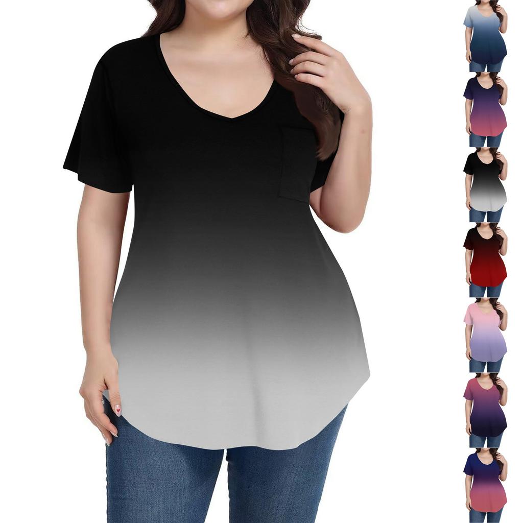 Women's Printing Large Size V-neck Top Loose Pocket T-shirt