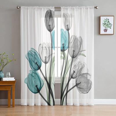 Turquoise Tulip Flower Sheer Drapes for Living Room Decoration Window Curtains for Kitchen Bedroom