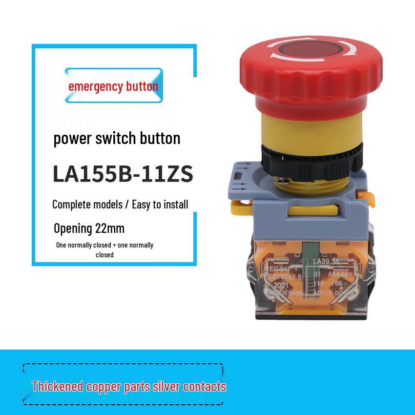 Emergency Stop Button Switch, No Light, 22MM, One Open/One Close, Silver Contact, Copper Parts, LA155B-11ZS.