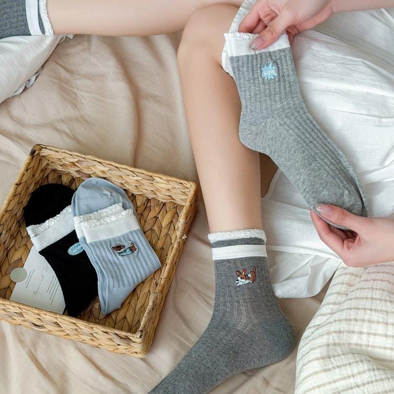 Women's Mid-Calf Japanese Cartoon Embroidery Socks, Spring/Autumn Style, Perfect Pair with Birkenstocks