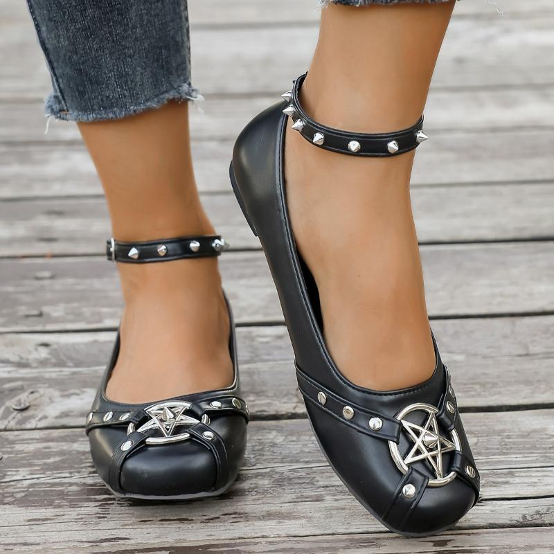 2026 Women's Mary Jane Shoes Ankle Buckle Strap Flats Leather Rivet Belt Metal Star Gothic Lolita Shoes Soft-soled Thin Shoes