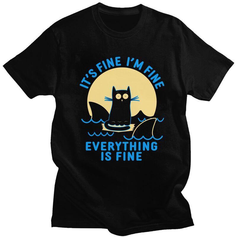 Its Fine Im Fine Everything Is Fine Shark Cat T Shirt for Men Short Sleeves Tee Shirt Streetwear Summer 100 Cotton Tee Tops