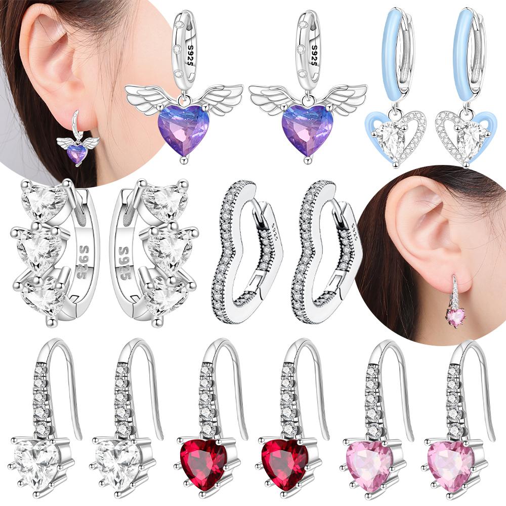 925 Silver White Heart Zircon Earring Pink Heart Wings for Women's Earrings Anniversary Jewelry Delicate Fine Gift