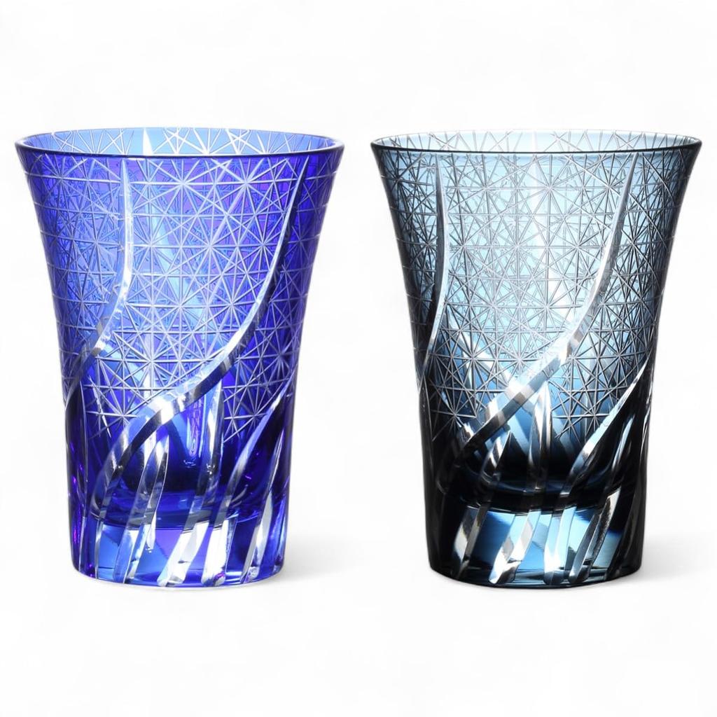 Mizukage Kiriko Pair Glass Cups 230cc Ranbori Komon Blue Ink Blue Bishou Current Model J-kitchens 8.4×11cm &