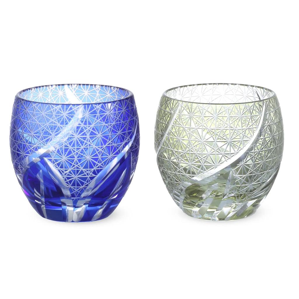 Nostalgia Cut Glass Pair Sake Cups 100cc Random Carving Pattern Blue Green Bishou Current Model J-kitchens Egg-Shaped 5.5×5.9cm &