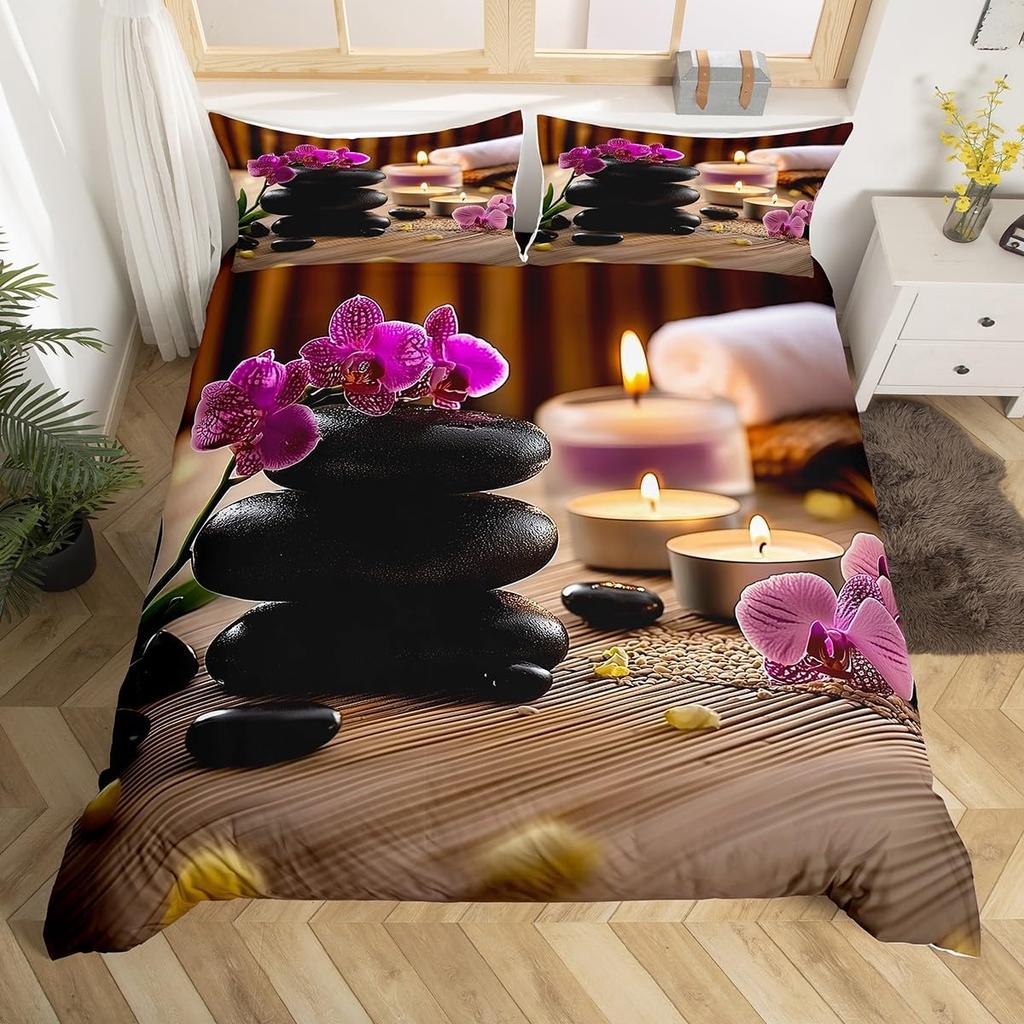 Comforter Minimalist Zen Stone Boho Comforter Purple Flowers Twin Bedding Setblack Stones Print Bed Set For Girls Woman