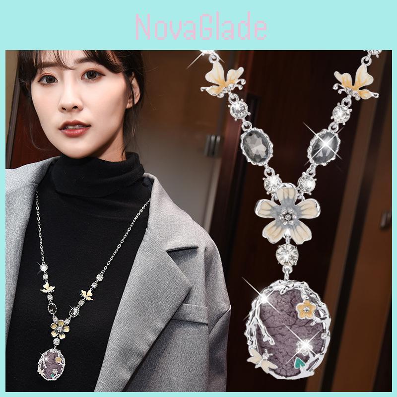 The necklace features a unique floral design that exudes femininity and grace. Its prominent elements include delicate crowns, enchanting eyes, whimsical butterflies, serene moons, and charming daisies, each meticulously detailed to create a captivating visual narrative. With a chain style that gracefully flows like rippling water, this accessory not only highlights your neckline but also adds a touch of sophistication to your ensemble. The mixed gemstone pendant serves as a dazzling centerpiece, reflecting light beautifully and drawing admiration from all who see it.