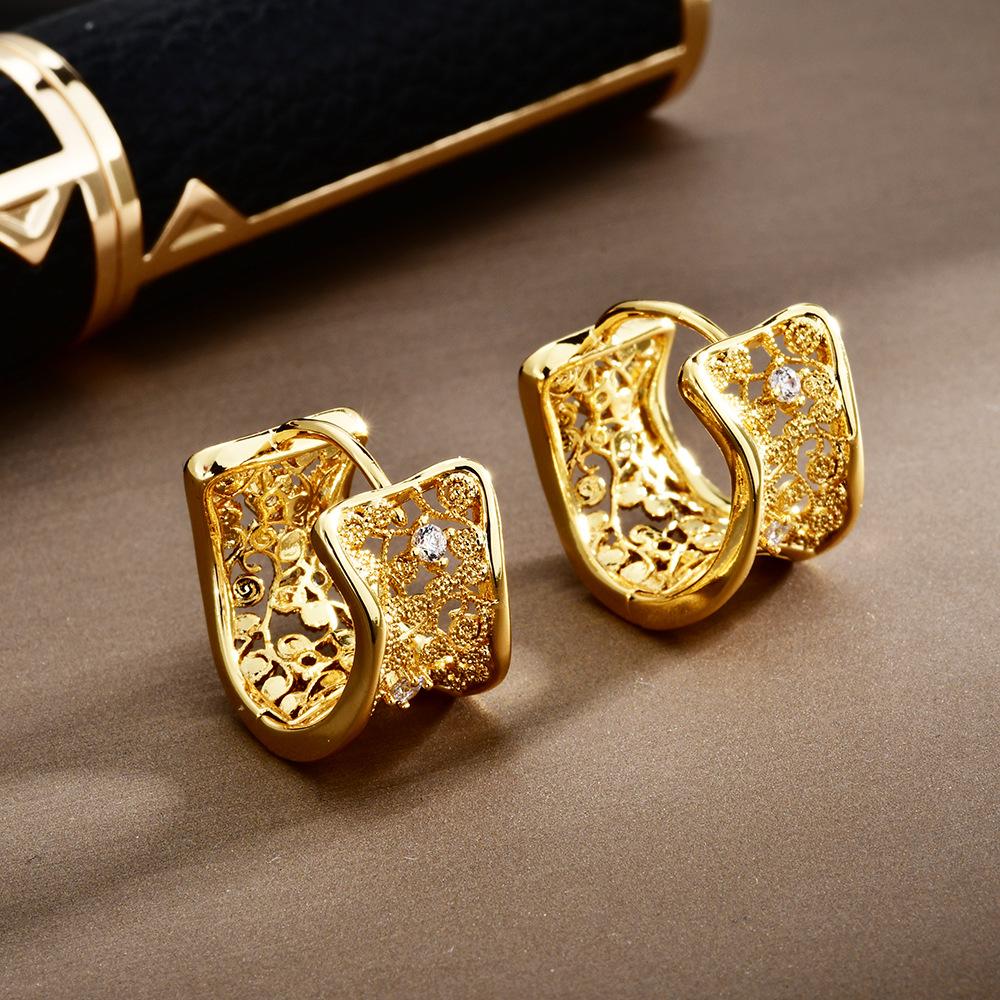 Attributes: Style: Vintage, Shape: Geometric, Material: zircon crystal, Upper Material: copper alloy, Feature: Hollow Filigree, Gold Plated, Wide Hoop, Zircon Accents, Light Luxury