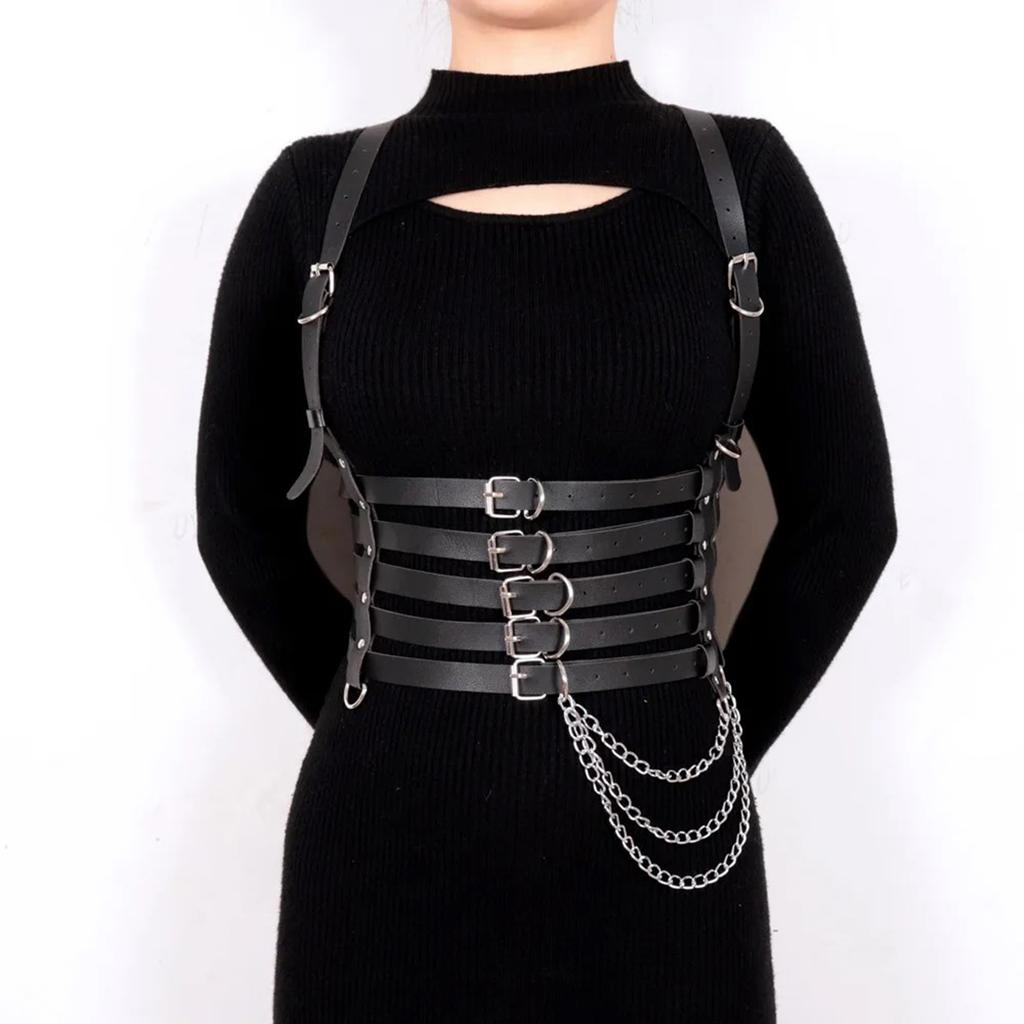 Women's Punk Rock Body Harness Belt with Chain - Adjustable Faux Leather Waist Cinch for Gothic Outfit