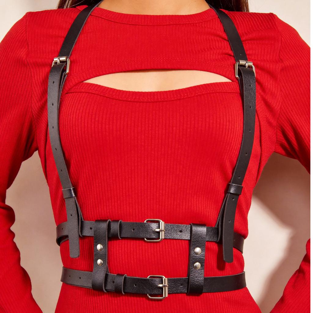 Women's Fashion Body Harness Belt - Black PU Leather Adjustable Straps for Dress & Clubbing Events