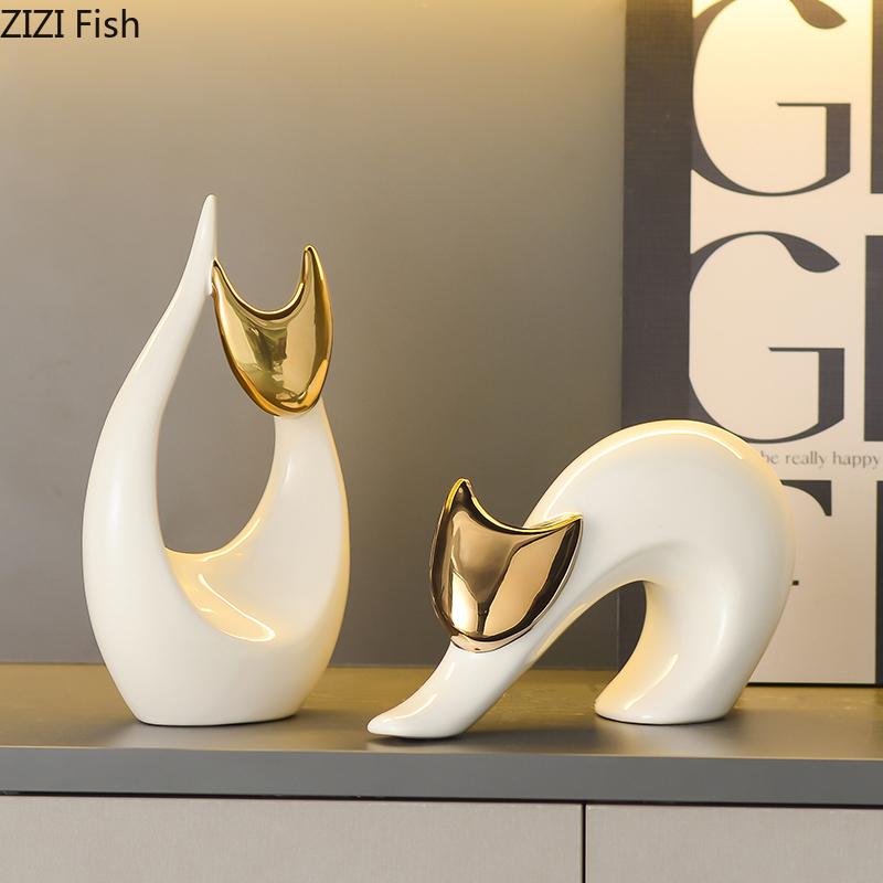 Sztuka Abstrakcyjna Ceramiczny Posążek Kotka Białe Ozdoby Zwierzęce Dekoracja Biurka Porcelanowa Rzeźba Kota Estetyka Wystroju Pomieszczenia