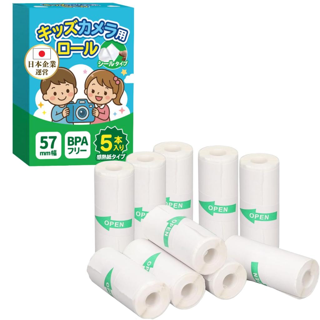 This is a 57 x 25 mm thermal roll paper set compatible with kids' cameras. Because it's a self-adhesive type, you can stick it wherever you like after printing. This replacement thermal roll is compatible with a wide range of models, including 57 mm wide instant cameras and photo printers for children. It uses high-quality thermal paper for crisp, clear prints. The large capacity allows for plenty of use, making it ideal for recording everyday memories and playtime. As it's a compatible type, you can use it with peace of mind while keeping costs down.