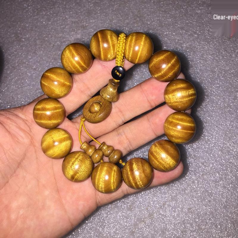 Golden Silk Phoebe Wood Bracelet 1.8: Unisex Water Ripple Design with Withered Wood, Wenwan Ornaments, Buddhist Beads.