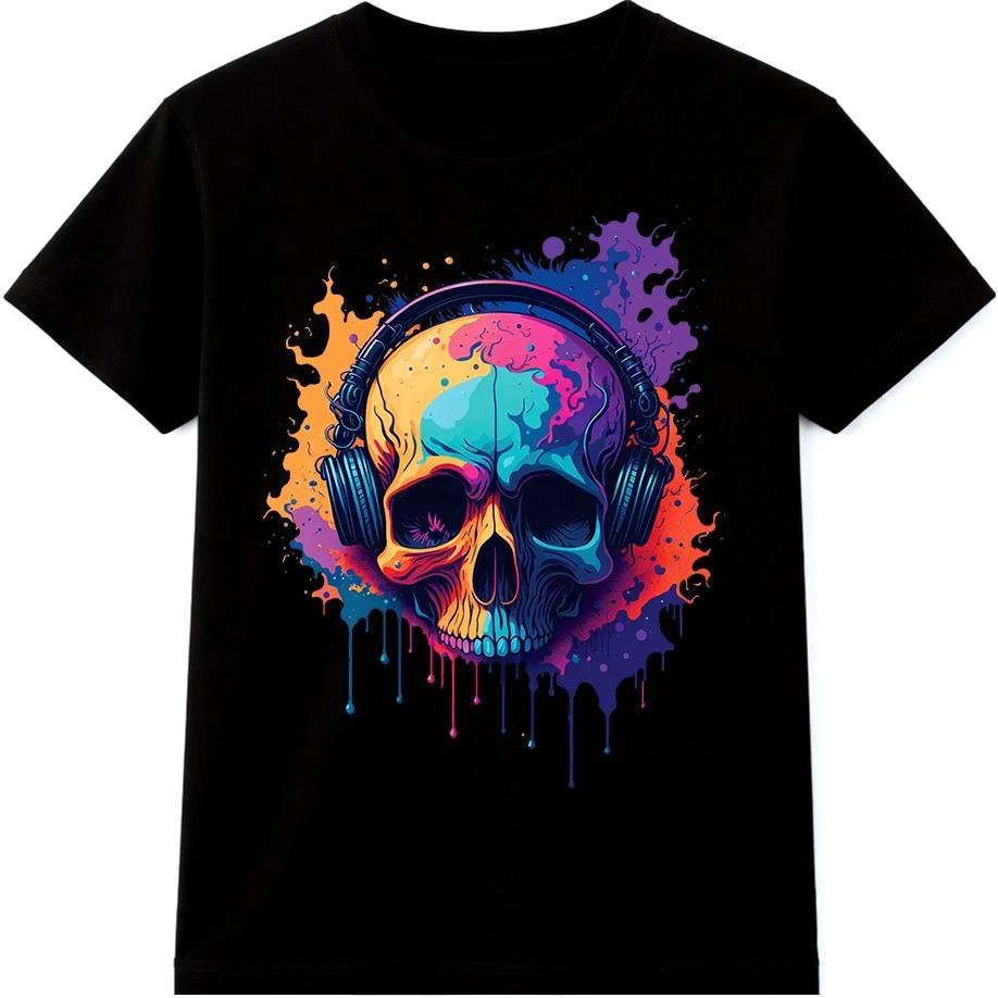 Skull Headphones T Shirt DJ Music Lover Graphic Tee Paint Splash Design