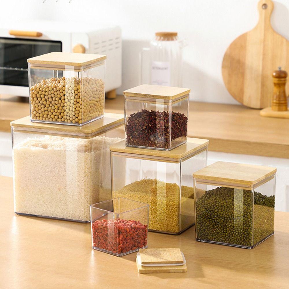 Transparent Square Storage Jars Bamboo Lids Sealed Can Kitchen Canister Moisture Proof Clear Spice Containers Kitchen