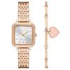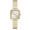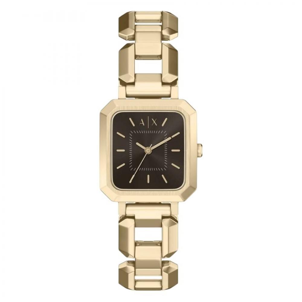 Gold-tone stainless steel case and bracelet. Fixed gold-tone stainless steel bezel. Brown dial with gold-tone hands and index hour markers. Dial Type: Analog. Quartz movement. Scratch resistant mineral crystal. Pull / push crown. Solid case back. Rectangle case shape, case size: 27 mm. Jewelry clasp. Water resistant at 50 meters / 165 feet. Functions: hour, minute, second. Leila Series. Dress watch style. Armani Exchange Leila Quartz Brown Dial Ladies Watch AX5738.