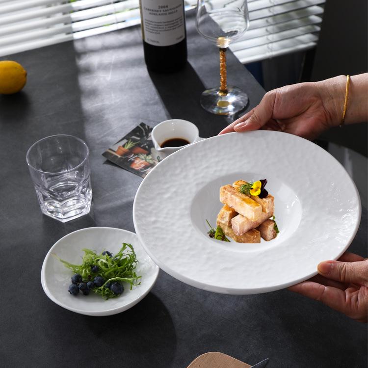 Ceramiczne talerzyki z motywem słomkowego kapelusza, malowane pod szkliwo: Talerze deserowe, do zup i makaronów o fakturze młotkowanej do użytku hotelowego
