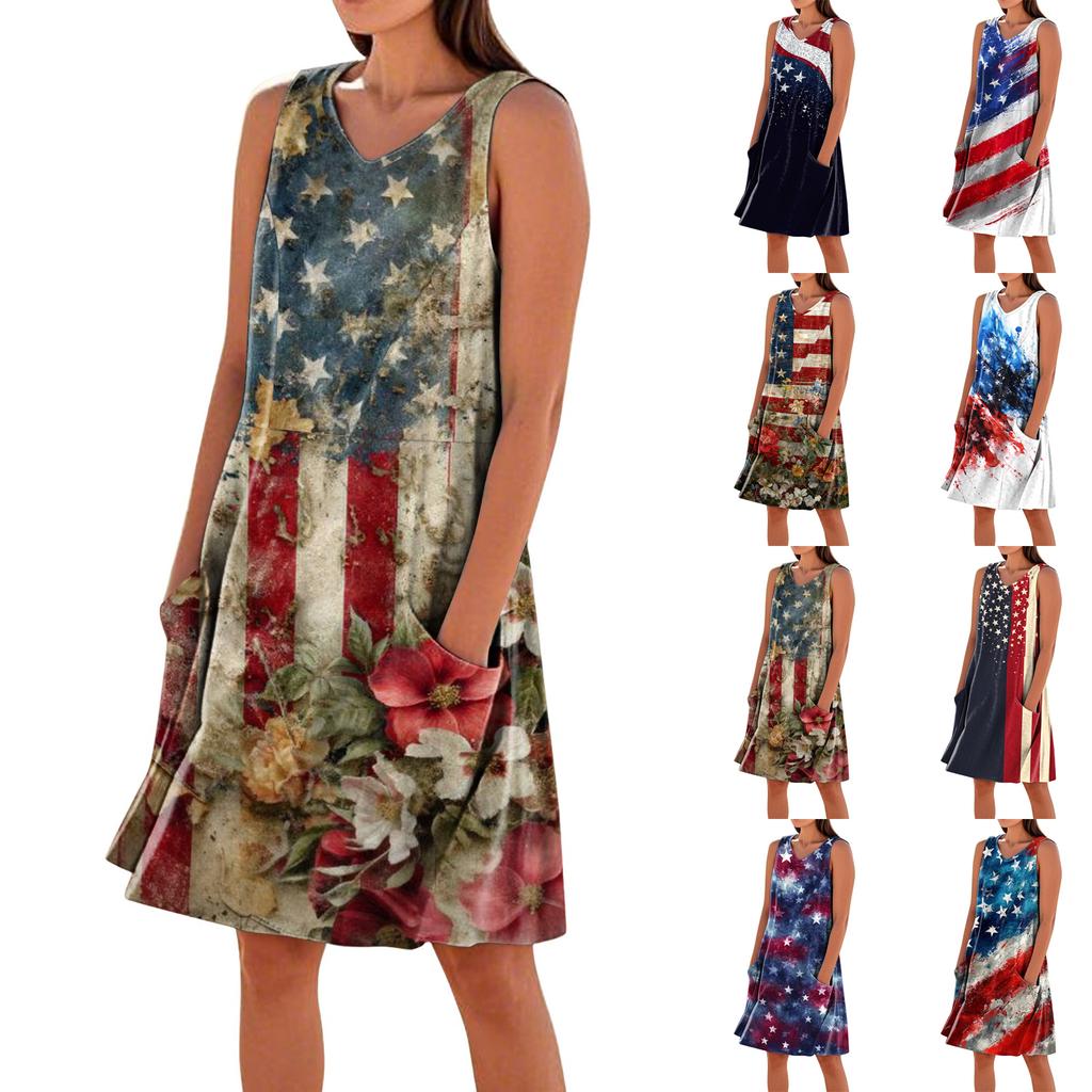 Letnie Sukienki Damskie Luźne na Plażę Wakacje Codzienne Bez Rękawów Dekolt V Sukienki Letnie Z Kieszeniami Sukienka na Ramiączkach