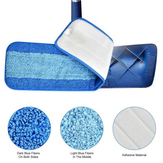 Głęboka efektywność czyszczenia: Nakładka do mopa z mikrofibry do głębokiego czyszczenia ma dwuwarstwowe włókna zaprojektowane do usuwania silnych zabrudzeń.. Ciemnoniebieskie włókna rozbijają uporczywe plamy, podczas gdy jasnoniebieskie włókna absorbują zabrudzenia, zapewniając dokładne czyszczenie trudnych powierzchni.. Ten ukierunkowany design umożliwia skuteczne usuwanie brudu bez agresywnego szorowania, dzięki czemu jest idealny do kuchni, łazienek i miejsc o dużym natężeniu ruchu.