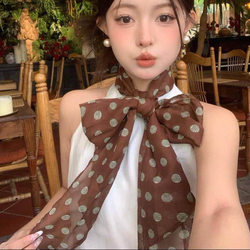 2025 Korean Style Silk Polka Dot Scarf Ribbon Neck Tie and Waist Belt for Women
